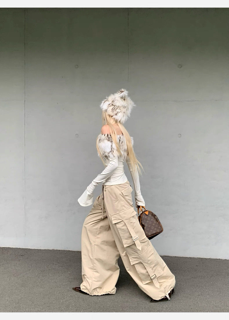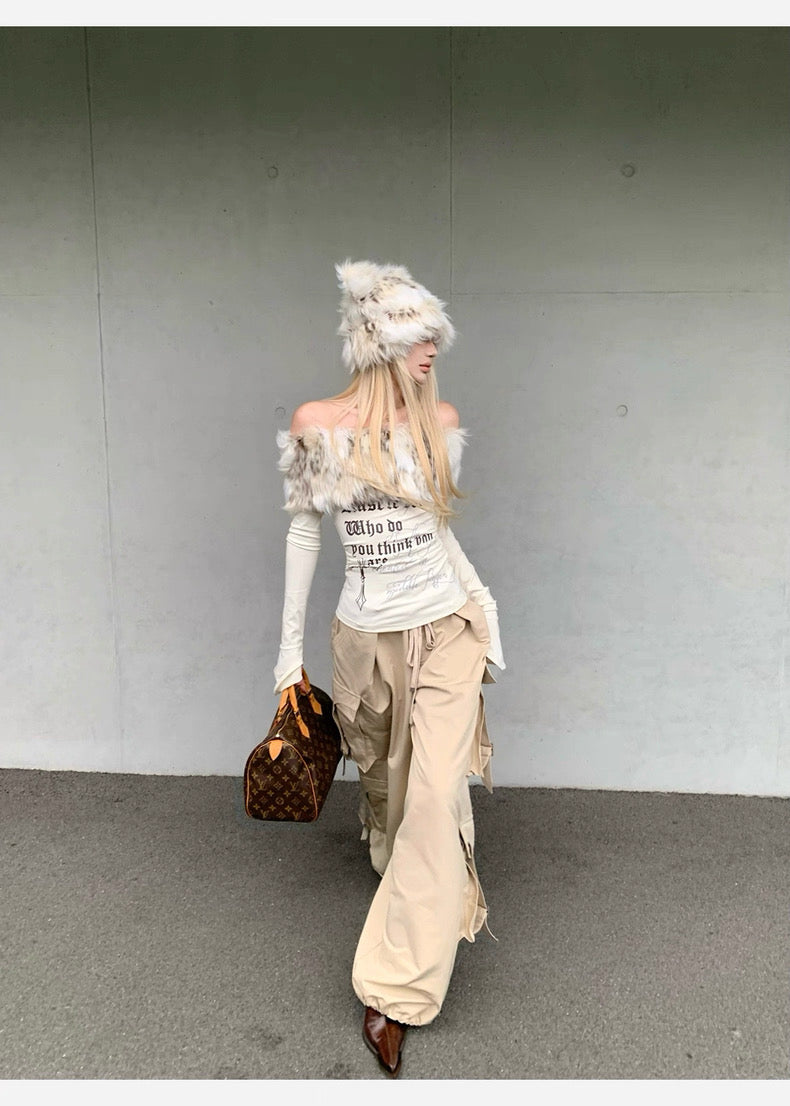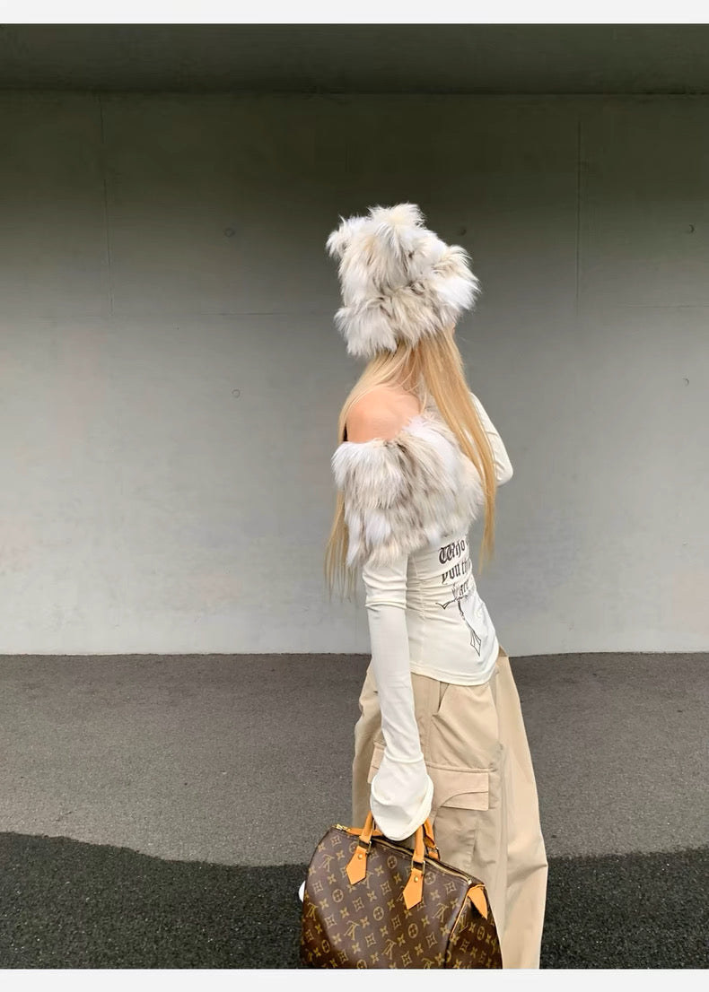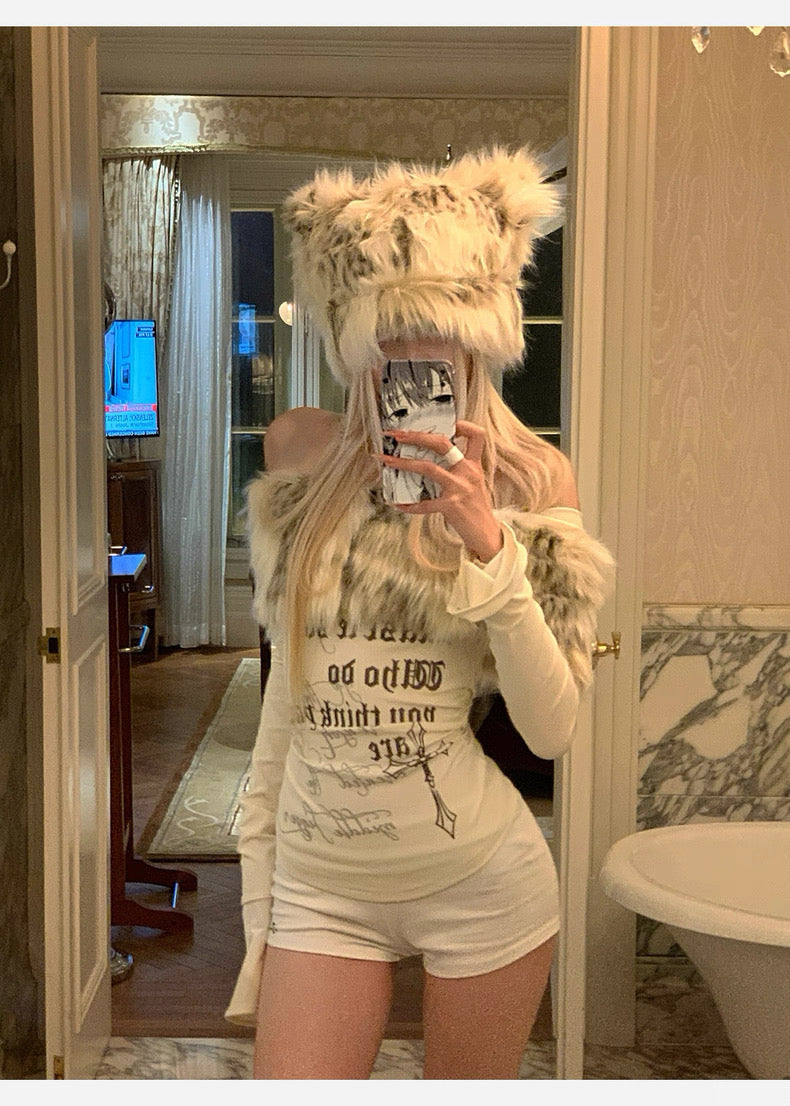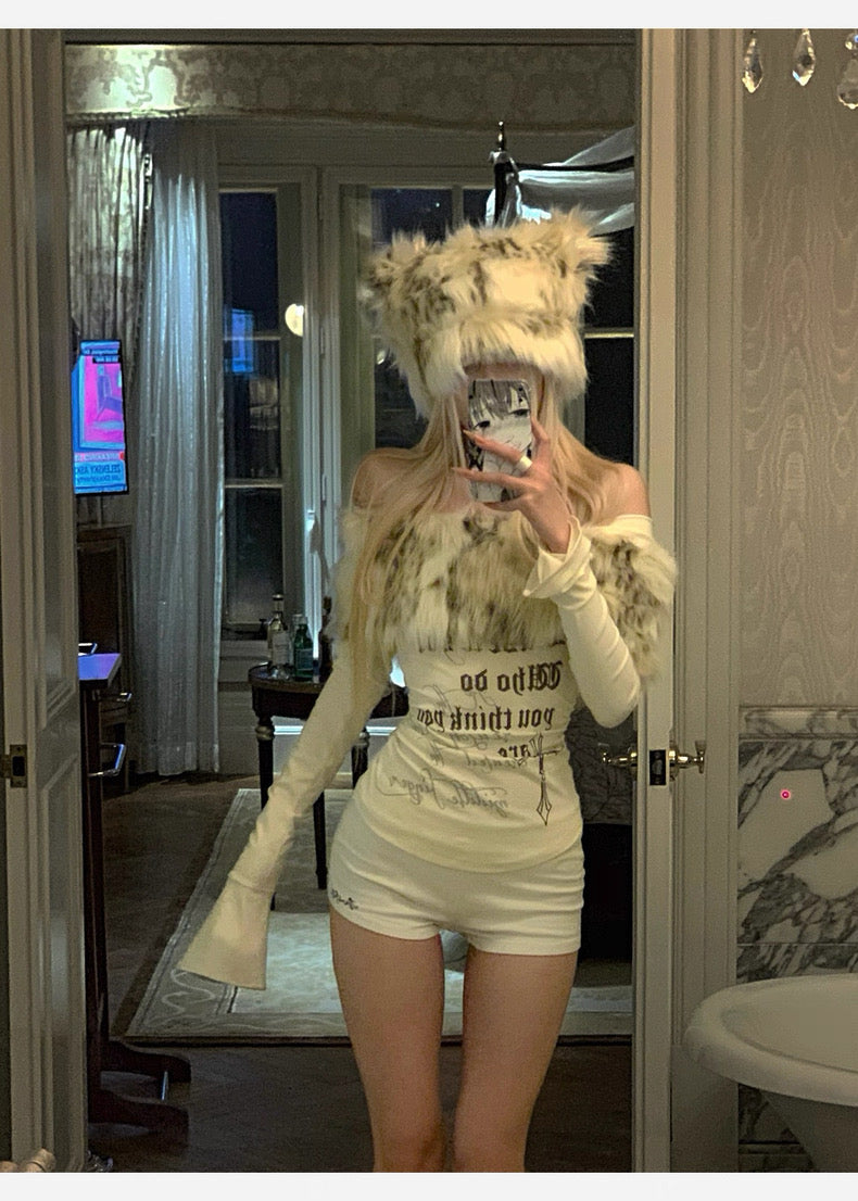 Faux Fur Off-Shoulder Long Sleeve Slim-Fit Waist-Cinching Top C0015