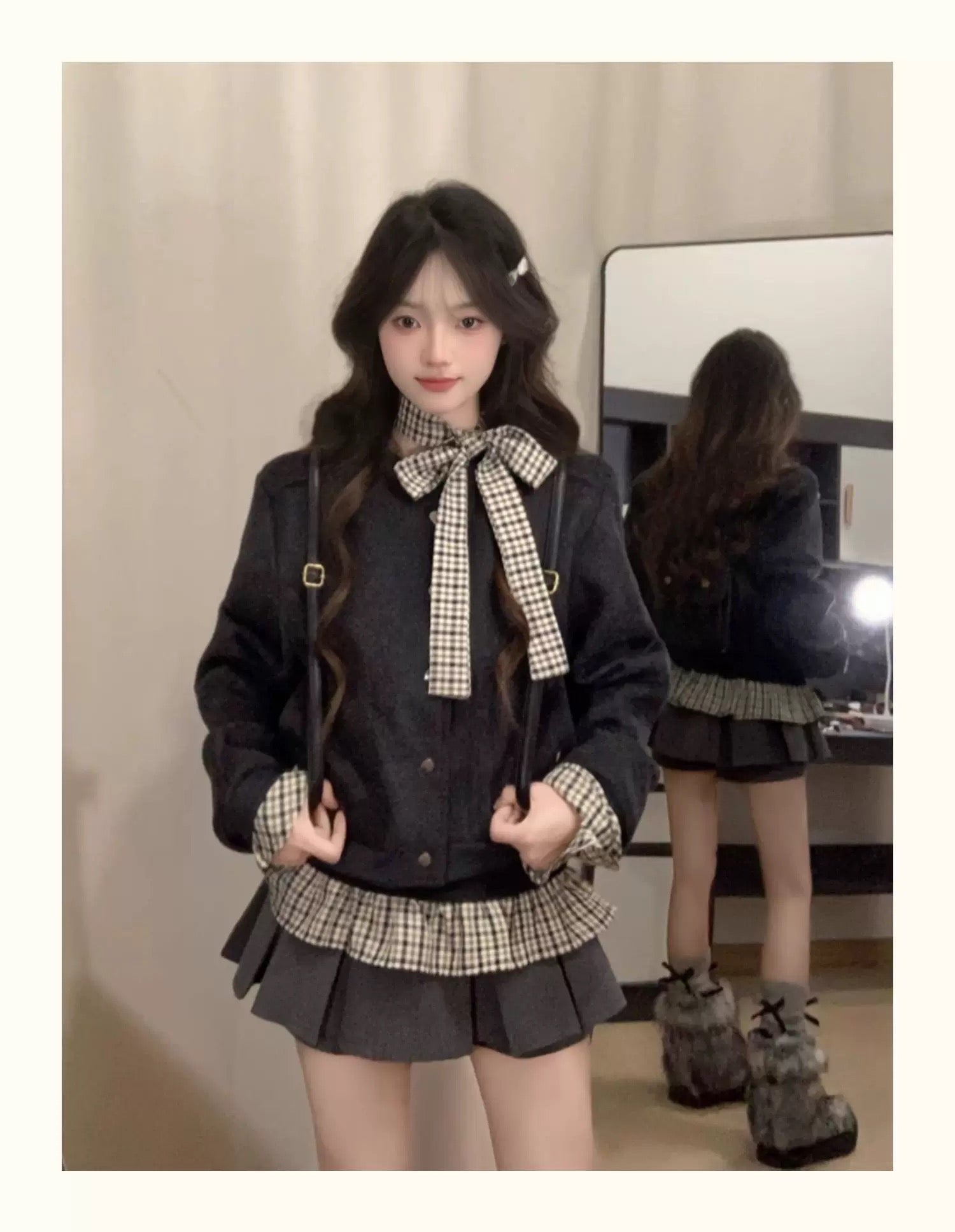 Wool-Blend Baseball Jacket Layered Long-Sleeve Tee & Pleated Skirt Set C0019